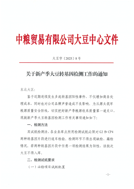 近日,中粮贸易有限公司大豆中心发布《关于新产季大豆转基因检测工作的通知》(大豆字〔2025〕8号),明确要求各业务库点在G2转基因片段检测中可使用安博金、Artron等资质完备品牌试纸。这一官方认可,标志着安博金生物在农产品质量安全检测领域的专业能力和产品质量获得国家级粮油企业的权威背书。